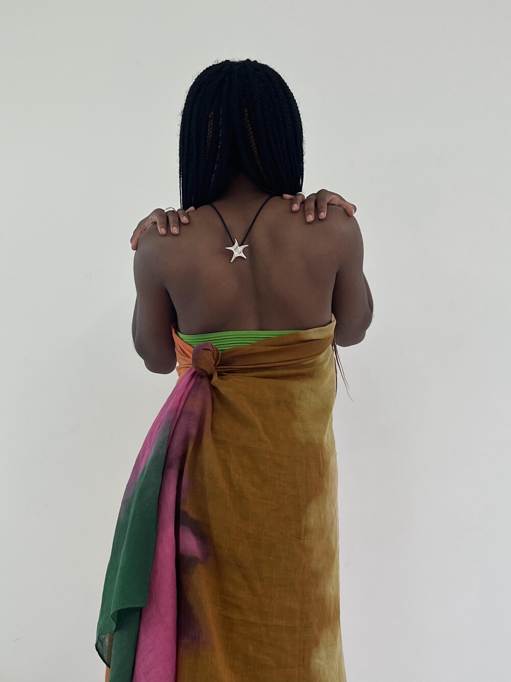 원하는 넥 라인에 맞게 자유롭게 두 번 매듭지어 착용할 수 있습니다.