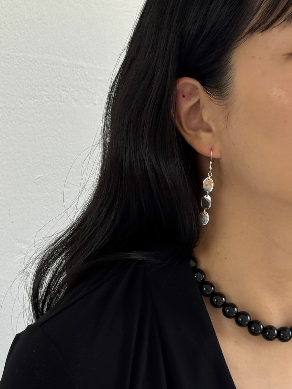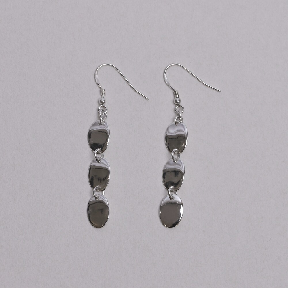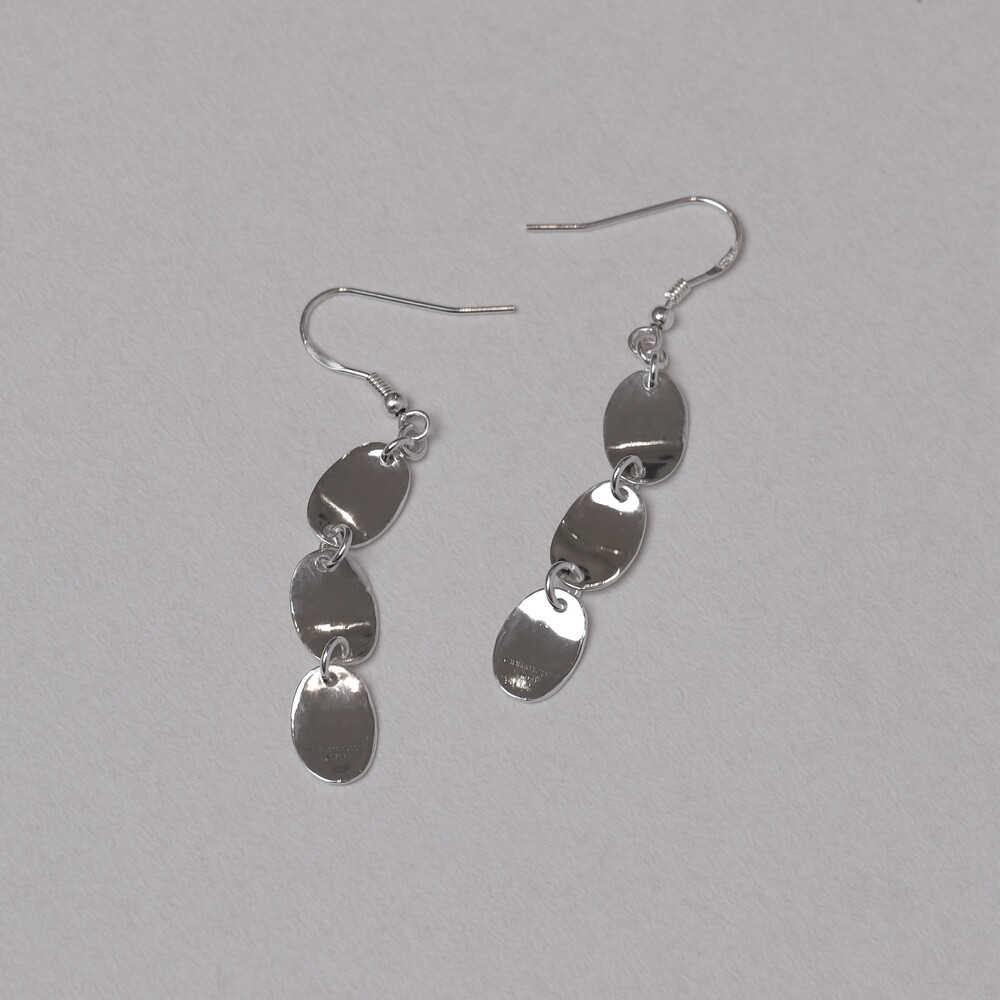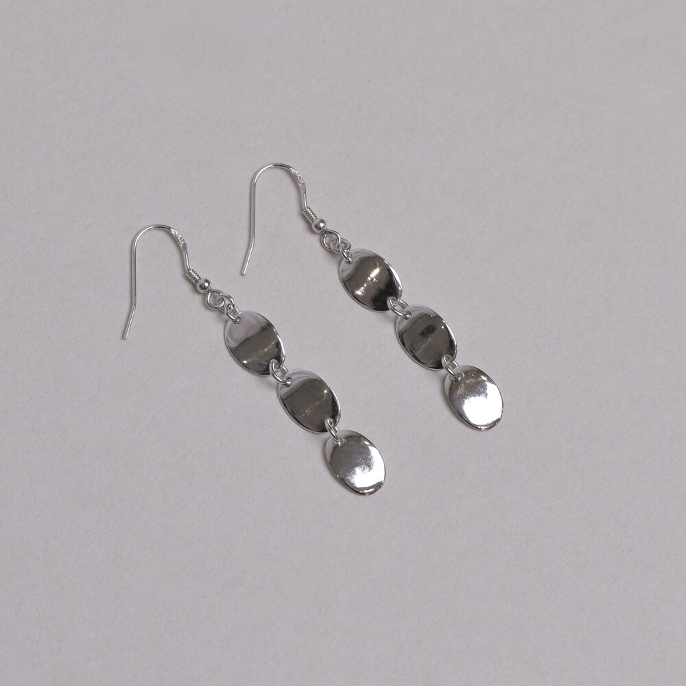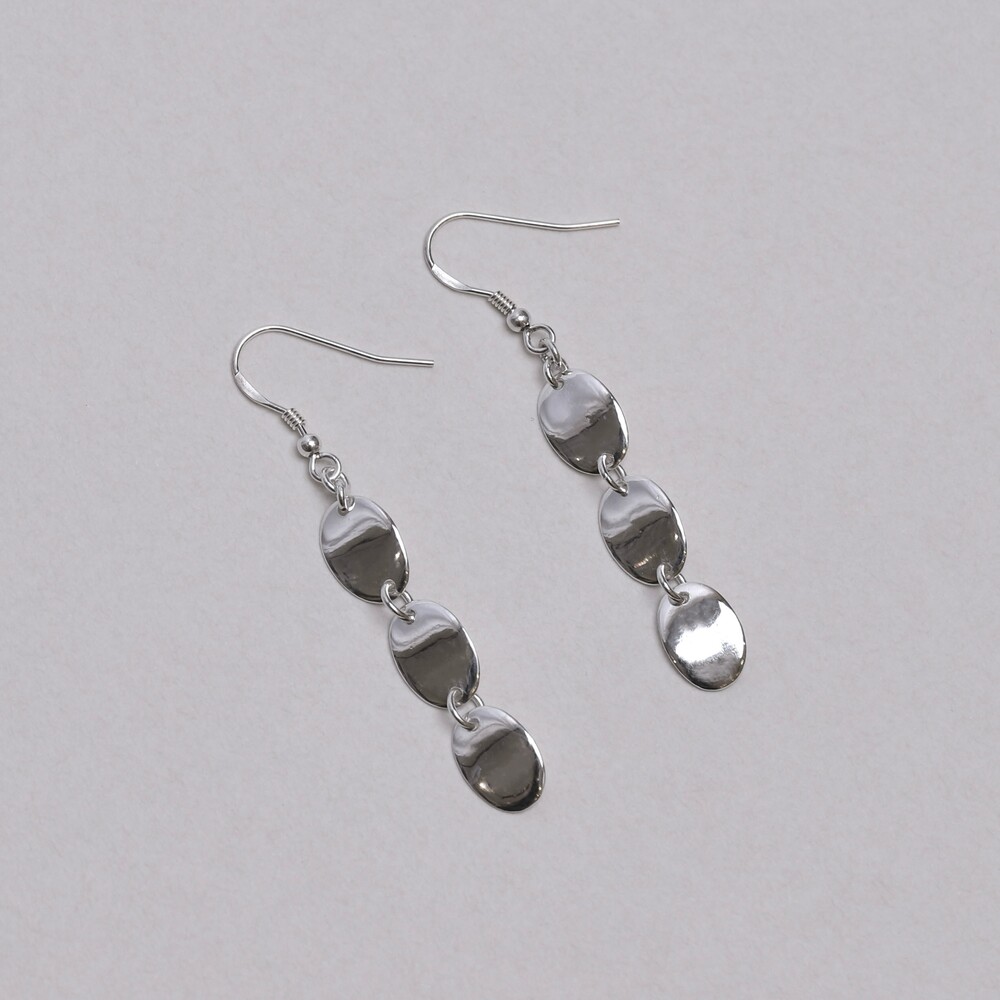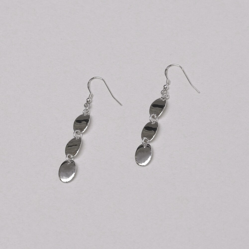 세 개의 타원형 실버 파츠가 유연하게 연결된 드롭형 귀걸이입니다.