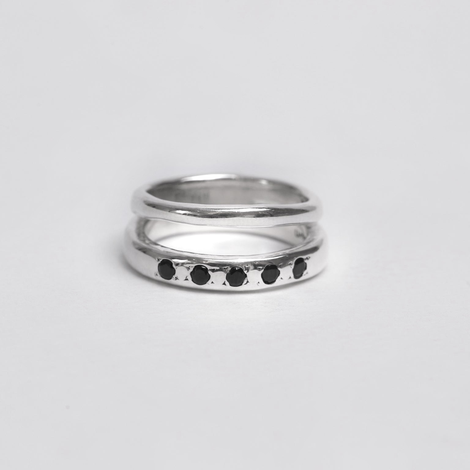 밴드 중앙에는 다섯 개의 블랙 스피넬을 조각물림 (grain setting)