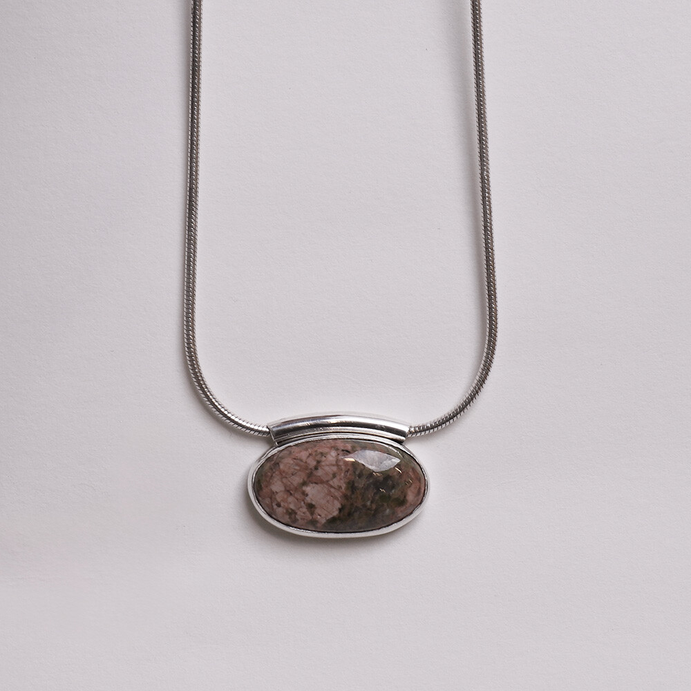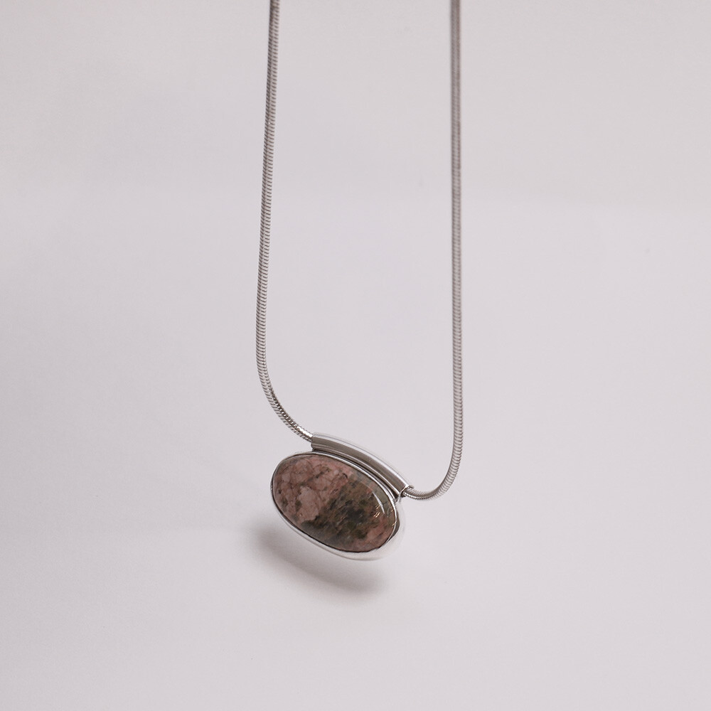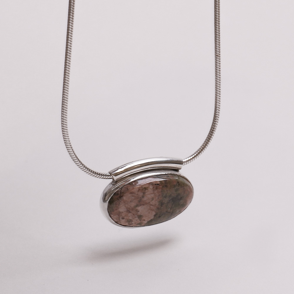 초록빛 에피도트와 온화한 핑크빛 장석이 무질서하게 섞인 유나카이트는
